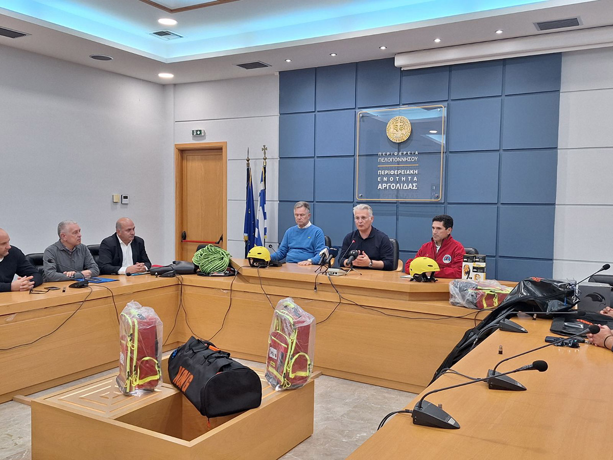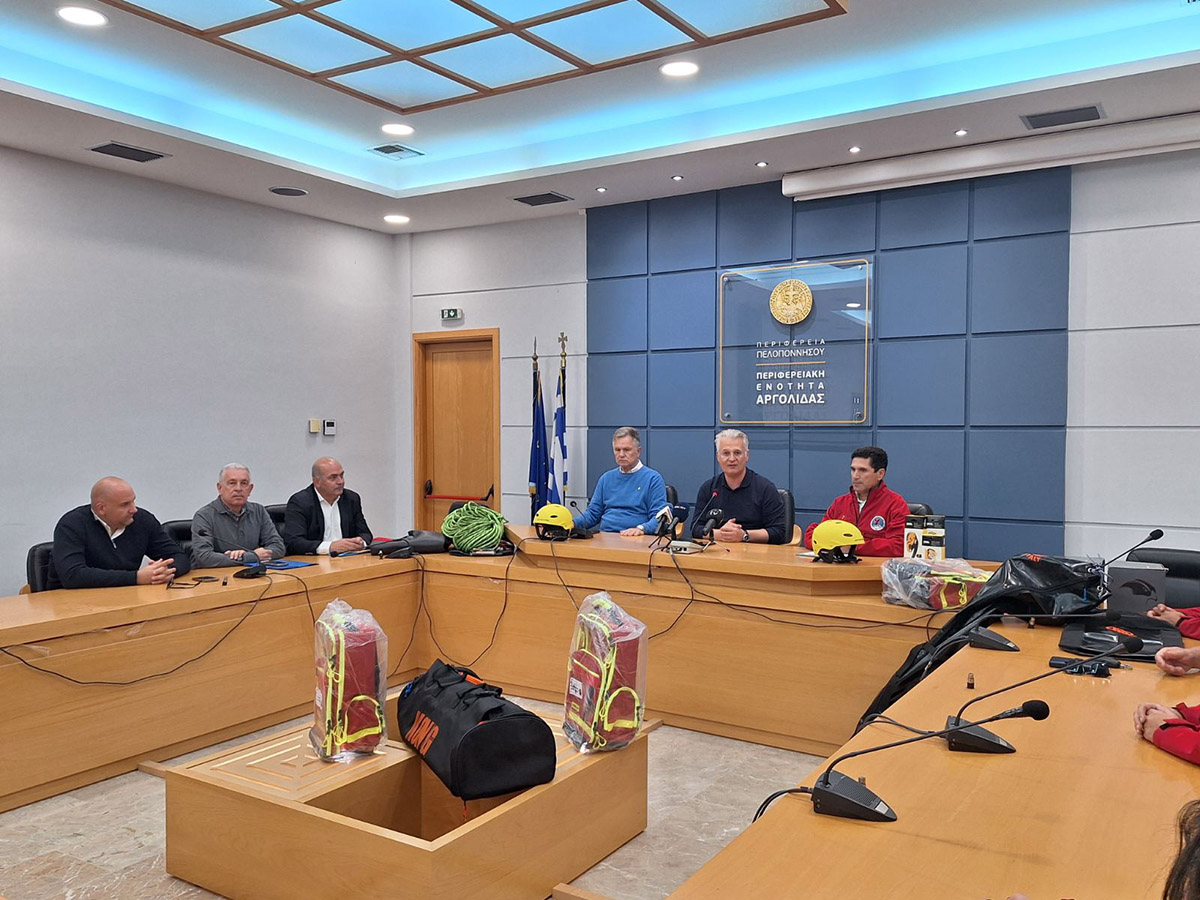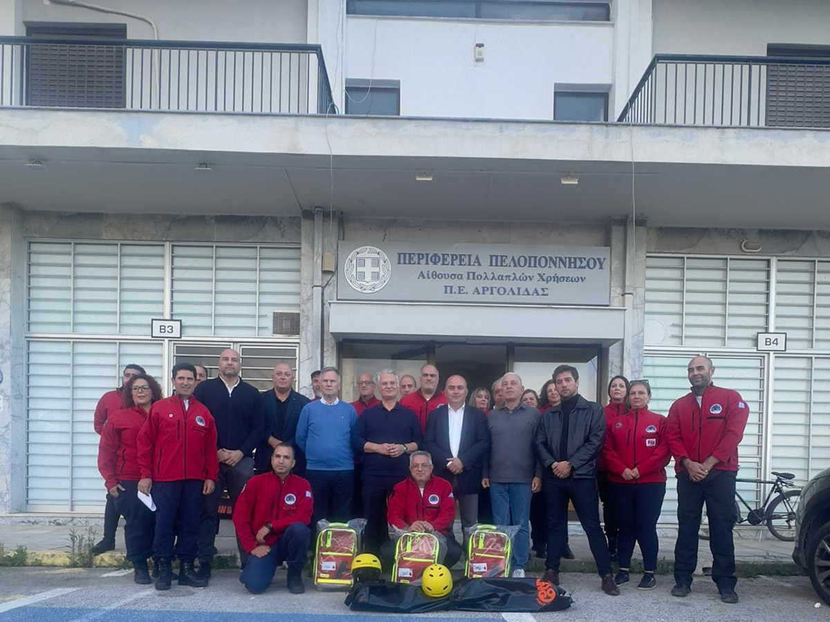 Σύγχρονο επιχειρησιακό εξοπλισμό ορεινής και σε υγρό στοιχείο διάσωσης — ορμητικά νερά και θάλασσα — παρέδωσε ο Περιφερειάρχης Πελοποννήσου Δημήτρης Πτωχός στην Ελληνική Ομάδα Διάσωσης, Παράρτημα Αργολίδας, σε ειδική τελετή που πραγματοποιήθηκε στην έδρα της Περιφερειακής Ενότητας το απόγευμα της Πέμπτης 6 Νοεμβρίου.