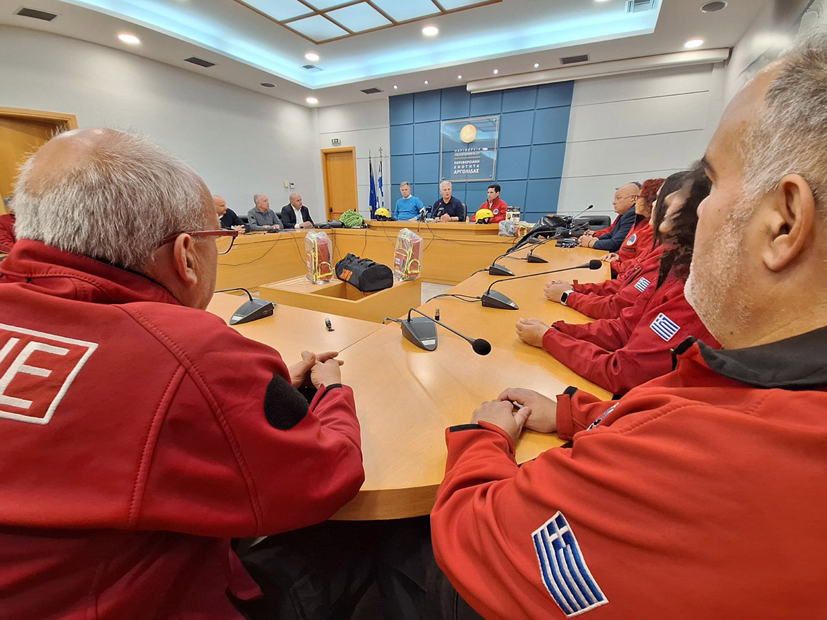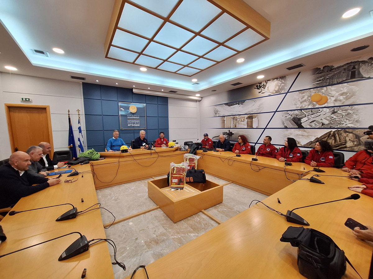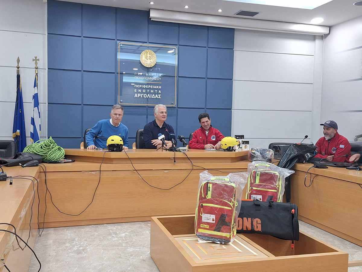 Σύγχρονο επιχειρησιακό εξοπλισμό ορεινής και σε υγρό στοιχείο διάσωσης — ορμητικά νερά και θάλασσα — παρέδωσε ο Περιφερειάρχης Πελοποννήσου Δημήτρης Πτωχός στην Ελληνική Ομάδα Διάσωσης, Παράρτημα Αργολίδας, σε ειδική τελετή που πραγματοποιήθηκε στην έδρα της Περιφερειακής Ενότητας το απόγευμα της Πέμπτης 6 Νοεμβρίου.