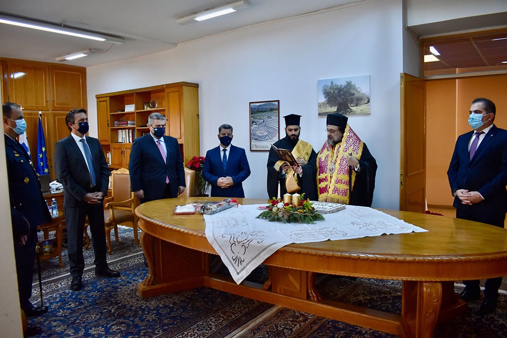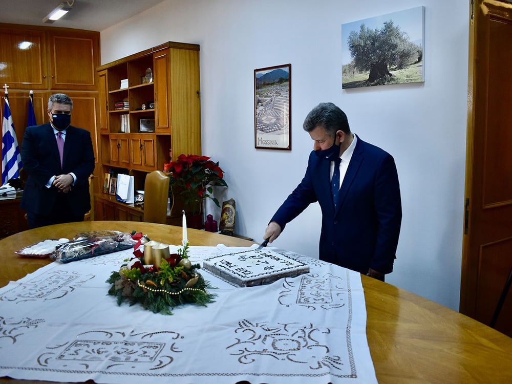 Στη συνέχεια, στο Διοικητήριο της Π.Ε. ο μητροπολίτης Μεσσηνίας Χρυσόστομος ευλόγησε την κοπή της παραδοσιακής πρωτοχρονιάτικης πίτας από τον αντιπεριφερειάρχη Μεσσηνίας Στάθη Αναστασόπουλο, παρουσία ελάχιστων εκπροσώπων των τοπικών Αρχών λόγω των υγειονομικών διατάξεων για την αποτροπή διάδοσης του κορονοϊού.