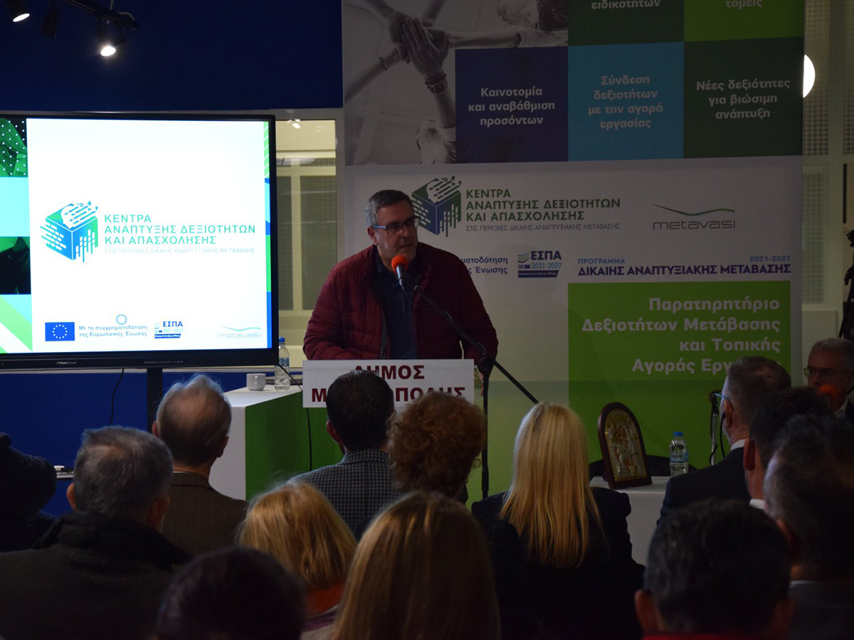 Με θερμά λόγια, ο Αντιπεριφερειάρχης Αρκαδίας, Κώστας Μανδρώνης, χαιρέτισε τα εγκαίνια του Κέντρου Ανάπτυξης Δεξιοτήτων και Απασχόλησης στη Μεγαλόπολη, υπογραμμίζοντας τη σημασία της πρωτοβουλίας για την περιοχή αλλά και για την ευρύτερη προσπάθεια της δίκαιης μετάβασης.