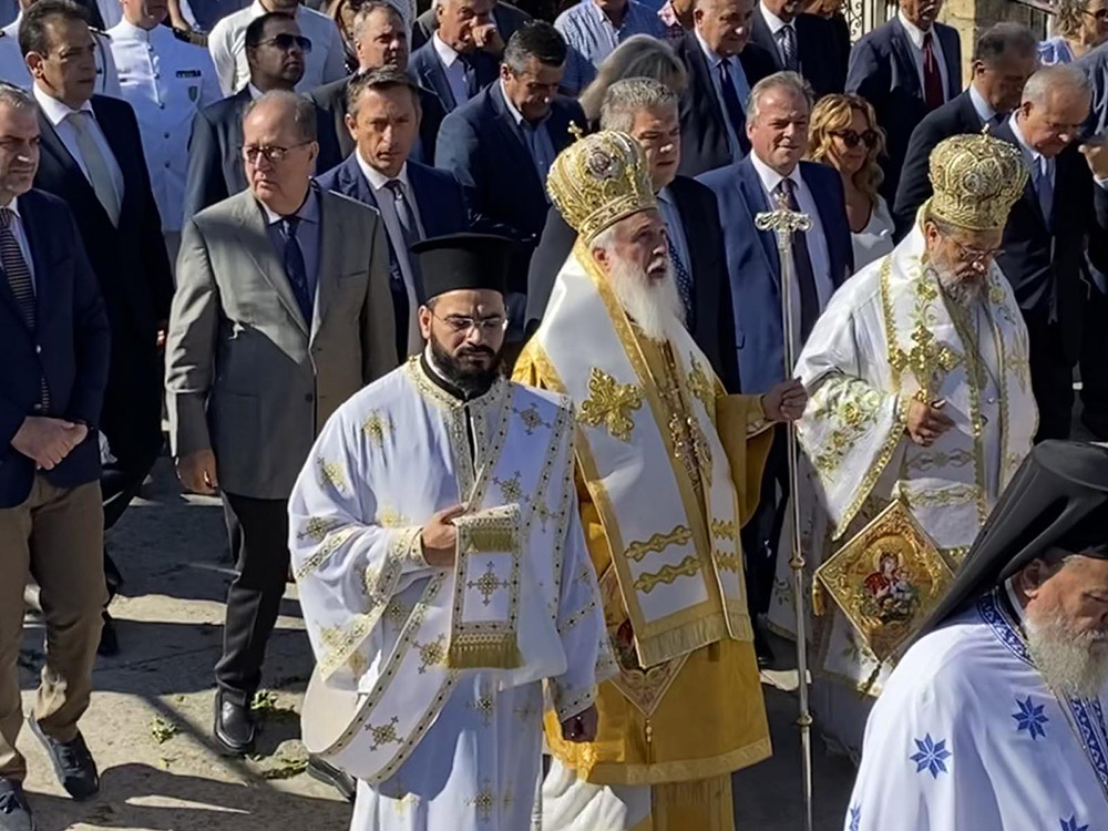 Ο περιφερειάρχης παρακολούθησε την θεία λειτουργία στον πανηγυρίζοντα ναό, της οποίας προεξήρχε ο μητροπολίτης Λήμνου και Αγίου Ευστρατίου Ιερόθεος -συλλειτουργούντων του επισκόπου Ωρεών Φιλοθέου και του μητροπολίτη Μεσσηνίας Χρυσοστόμου-, όπως και την λιτάνευση της εικόνας που ακολούθησε.