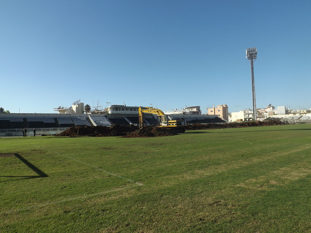 Ηδη, μετά την τοπογραφική αποτύπωση, ξεκίνησε η εργασία εξυγίανσης και ο καθαρισμός της επιφάνειας του γηπέδου και θα ακολουθήσει η διαμόρφωση της κατάλληλης υποδομής για την αποστράγγιση των ομβρίων υδάτων καθώς και η εγκατάσταση του συστήματος διαβροχής του χλοοτάπητα.