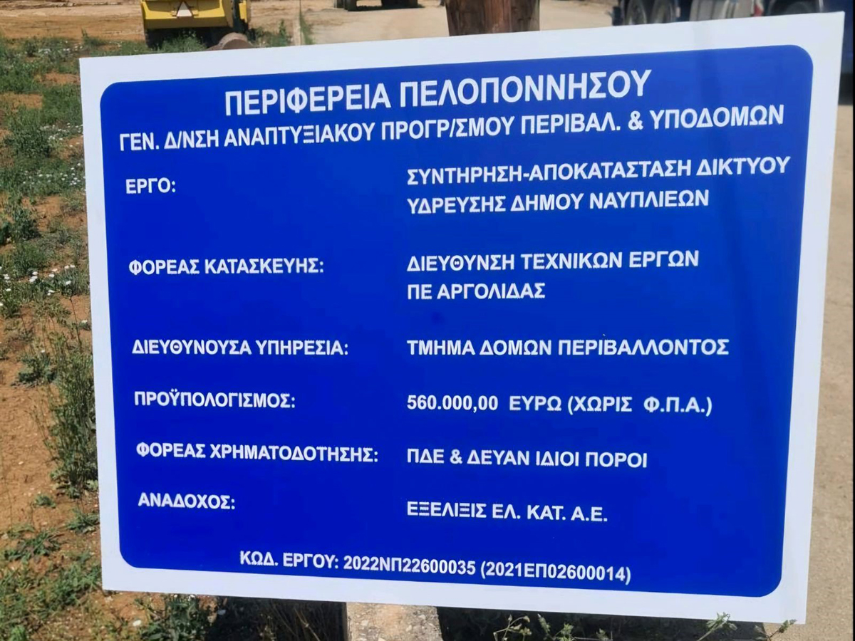 Συνεχίζεται με ταχύ ρυθμό το έργο της Συντήρησης και Αποκατάστασης του Δικτύου Ύδρευσης στον Δήμο Ναυπλιέων, με συνολικό προϋπολογισμό 560.000 ευρώ, εξασφαλίζοντας τη βελτίωση των υδάτινων υποδομών της περιοχής. Το έργο υλοποιείται από την Περιφερειακή Ενότητα Αργολίδας, στο πλαίσιο Προγραμματικής Σύμβασης ανάμεσα στην Περιφέρεια Πελοποννήσου, η οποία συνεισφέρει με 400.000 ευρώ, και τη Δημοτική Επιχείρηση Ύδρευσης Αποχέτευσης Ναυπλίου (Δ.Ε.Υ.Α.Ν.), η οποία διαθέτει 160.000 ευρώ.
