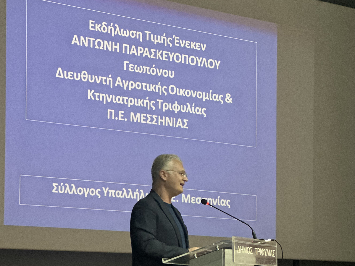 Σε κλίμα συγκίνησης, αλλά και αναγνώρισης της πολυετούς προσφοράς του, πραγματοποιήθηκε την Κυριακή 14 Δεκεμβρίου στην Κυπαρισσία η τιμητική εκδήλωση για τον Αντώνη Παρασκευόπουλο, διευθυντή της Διεύθυνσης Αγροτικής Οικονομίας και Κτηνιατρικής Τριφυλίας, με αφορμή τη συνταξιοδότησή του.
