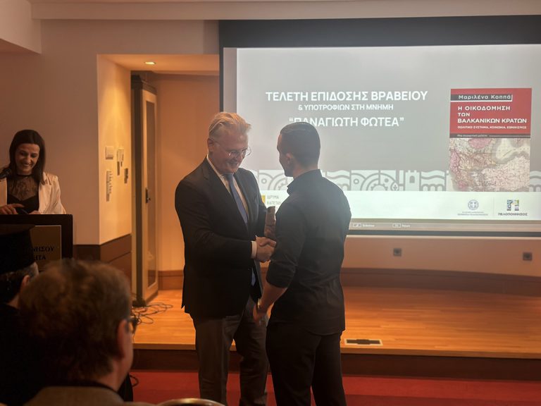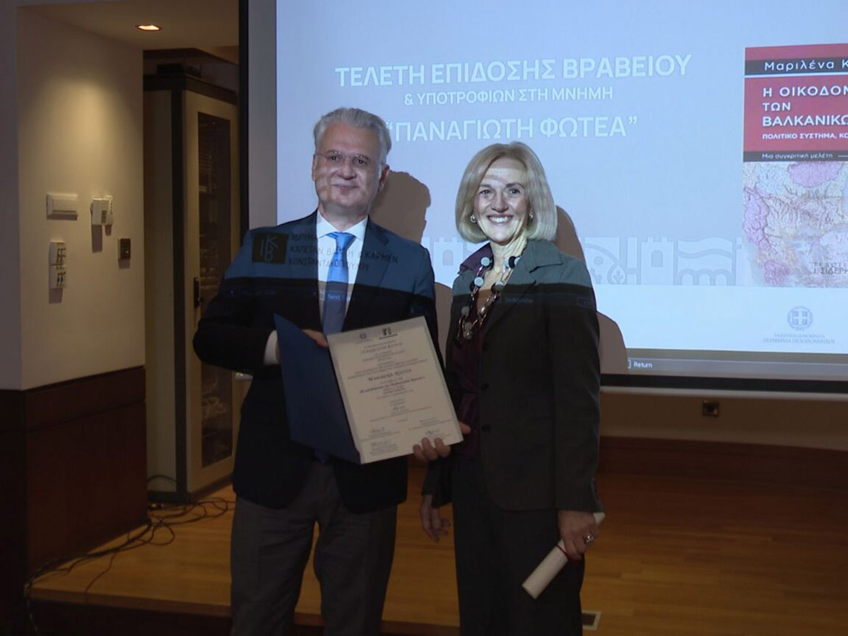 Στην εκδήλωση βραβεύθηκε για το βιβλίο της η κα. Μαριλένα Κοππά, κοσμήτορος της Σχολής Διεθνών Σπουδών, Επικοινωνίας και Πολιτισμού του Παντείου Πανεπιστημίου και καθηγήτριας Συγκριτικής Πολιτικής στο Τμήμα Διεθνών και Ευρωπαϊκών Σπουδών του ιδίου Ιδρύματος, με τίτλο: «Η οικοδόμηση των Βαλκανικών Κρατών».